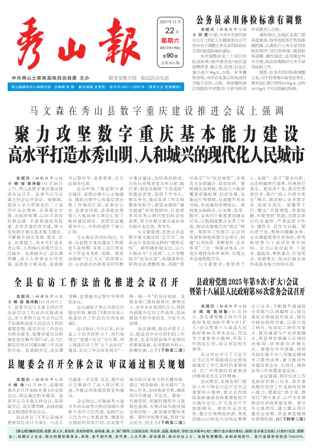 县政府党组2025年第9次(扩大)会议 暨第十八届县人民政府第86次常务会议召开 县规委会召开全体会议 审议通过相关规划 全县信访工作法治化推进会议召开 马文森在秀山县数字重庆建设推进会议上强调 聚力攻坚数字重庆基本能力建设  高水平打造水秀山明、人和城兴的现代化人民城市 公务员录用体检标准有调整