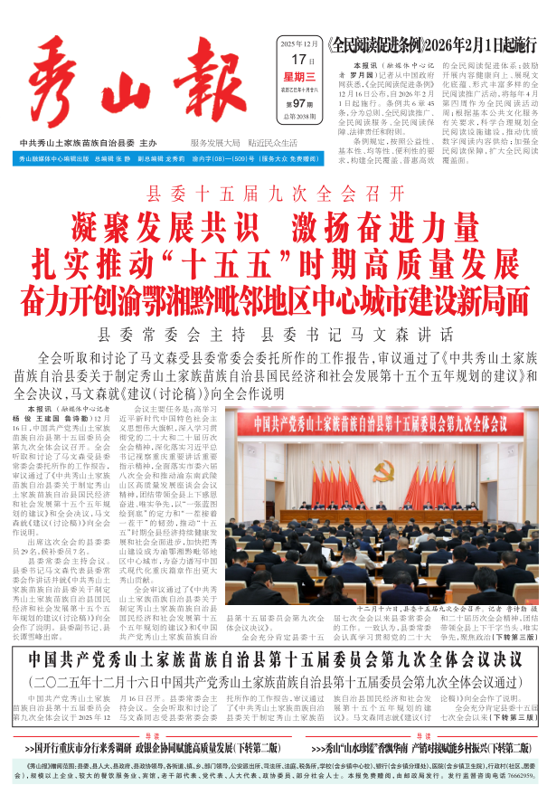 导 读 中国共产党秀山土家族苗族自治县第十五届委员会第九次全体会议决议 (二〇二五年十二月十六日中国共产党秀山土家族苗族自治县第十五届委员会第九次全体会议通过) 县委十五届九次全会召开 凝聚发展共识  激扬奋进力量 扎实推动“十五五”时期高质量发展 奋力开创渝鄂湘黔毗邻地区中心城市建设新局面 县委常委会主持 县委书记马文森讲话 《全民阅读促进条例》2026年2月1日起施行