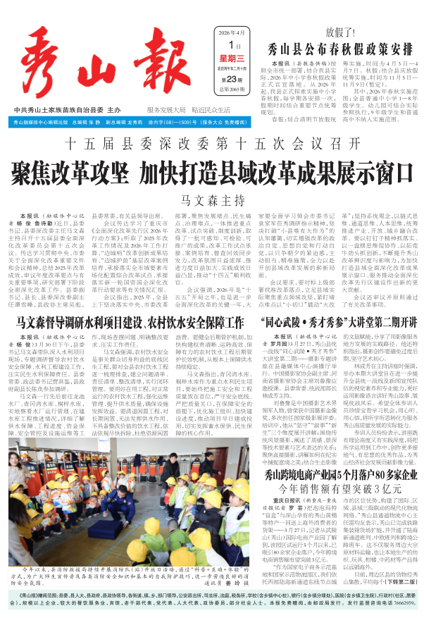 秀山跨境电商产业园5个月落户80多家企业 今年销售额有望突破3亿元 图片新闻 马文森督导调研水利项目建设、农村饮水安全保障工作 放假了!秀山县公布春秋假政策安排 “同心武陵•秀才秀参”大讲堂第二期开讲 十五届县委深改委第十五次会议召开 聚焦改革攻坚 加快打造县域改革成果展示窗口 马文森主持