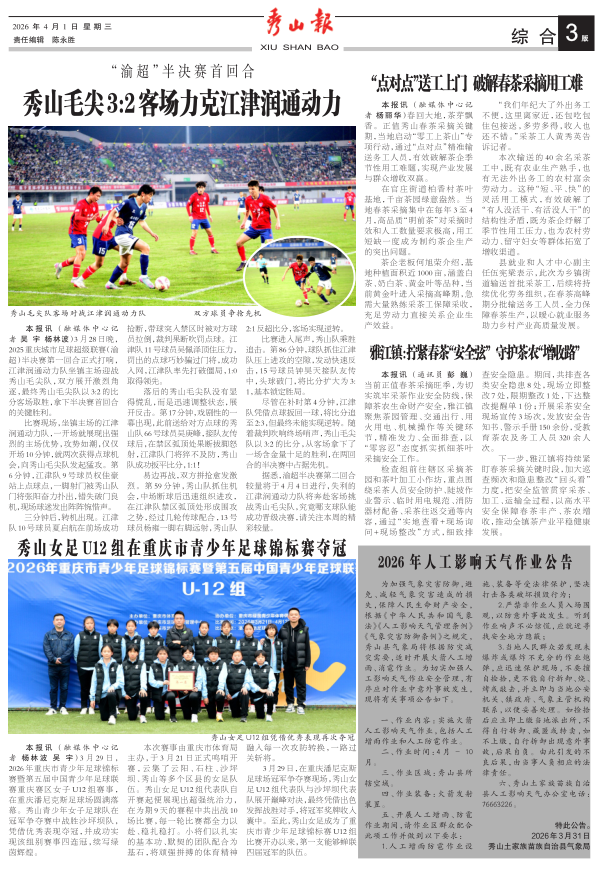 “渝超”半决赛首回合 秀山毛尖3:2客场力克江津润通动力