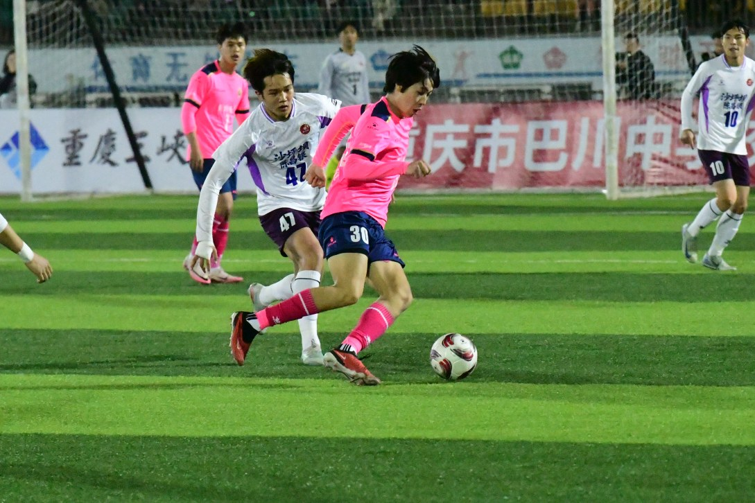 比赛中,身穿粉色球衣的秀山队队员正在带球突围
