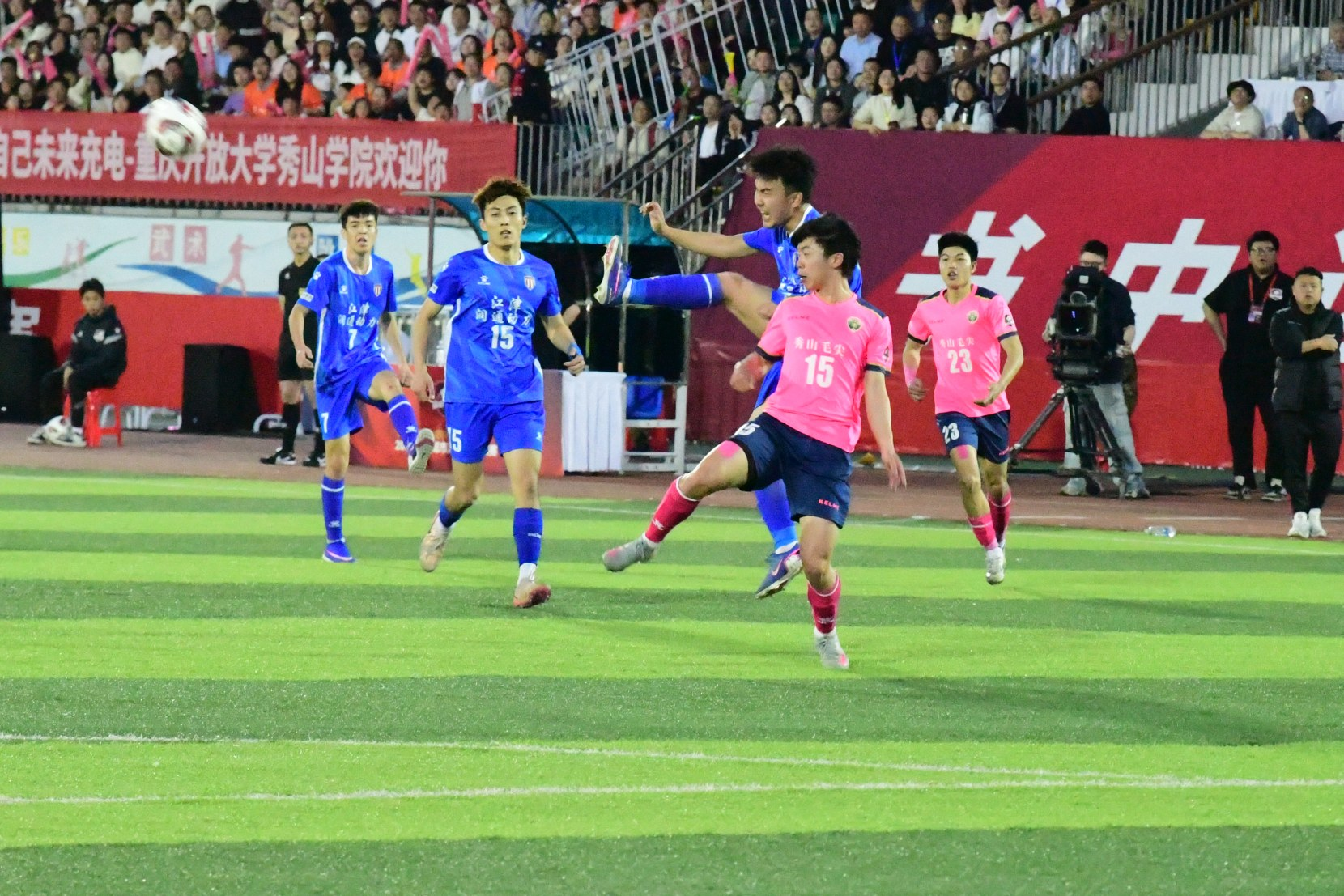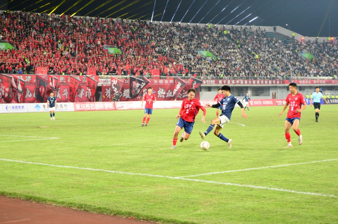 比赛中,身穿蓝色球衣的秀山队队员正在断球