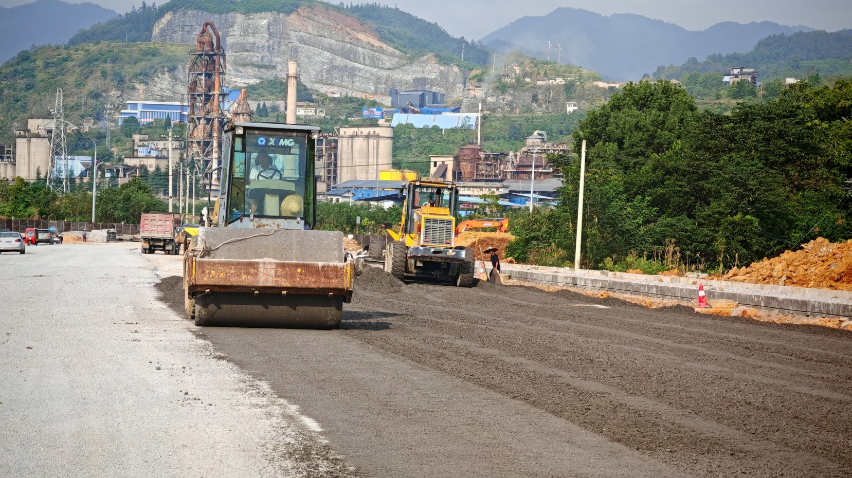 今年国庆与中秋双节叠加,假日期间晴好天气为项目建设按下“加速键”。全县各在建项目纷纷放弃假期休息,抢工期、抓进度,推进项目建设。(图为园区二路延伸段施工现场,目前,施工方正利用晴好天气抢赶工期,预计项目将于今年11月底如期完工。)