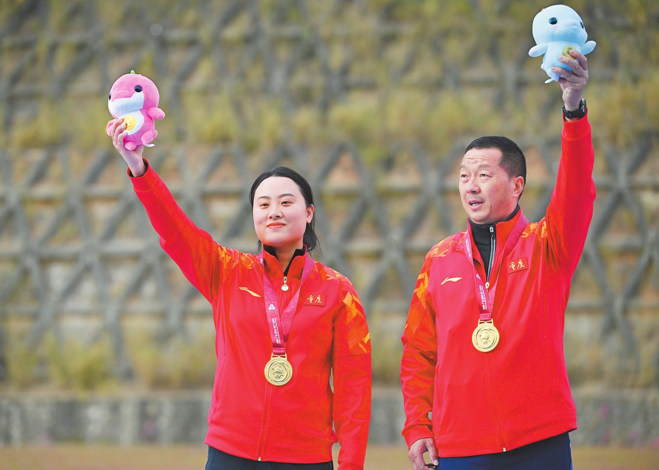 11月19日,重庆选手范馨月(左)和教练员陈亮(右)在颁奖仪式上。(本组图片由首席记者龙帆摄/视觉重庆)