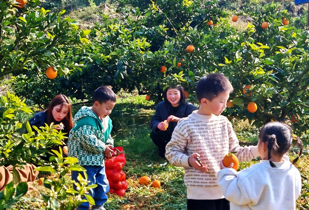 家长带着孩子穿梭在果树间,辨认成熟的柑橘、体验亲手采摘的乐趣,欢声笑语洒满果园。