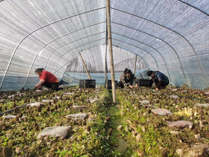 2月11日,记者走进龙凤坝镇的羊肚菌种植基地看到,一排排标准化大棚整齐排列。棚内温暖湿润,空气中弥漫着菌菇特有的清香。菌床上,一朵朵羊肚菌探出“脑袋”,菌盖纹理清晰,肉质厚实。农户们手持小刀,娴熟地捏住菌柄底部轻轻一划,便将成熟的羊肚菌采入筐中。