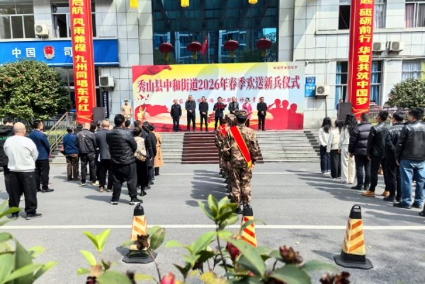 3月13日下午,中和街道举行2026年春季新兵入伍欢送仪式,8名优秀青年带着家乡人民的祝福与期盼,踏上军旅征程。